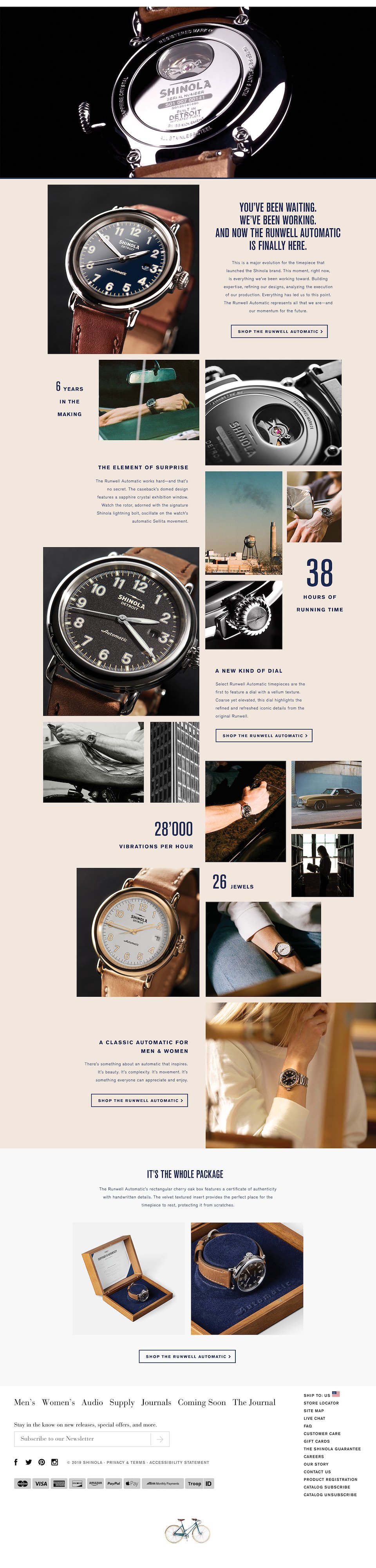 The Landing Page for Shinola's launch of the Automatic movement in their key product, The Runwell watch.