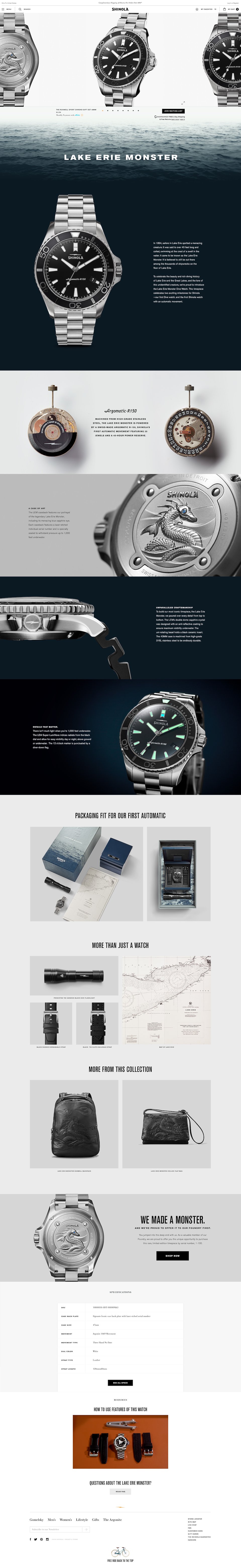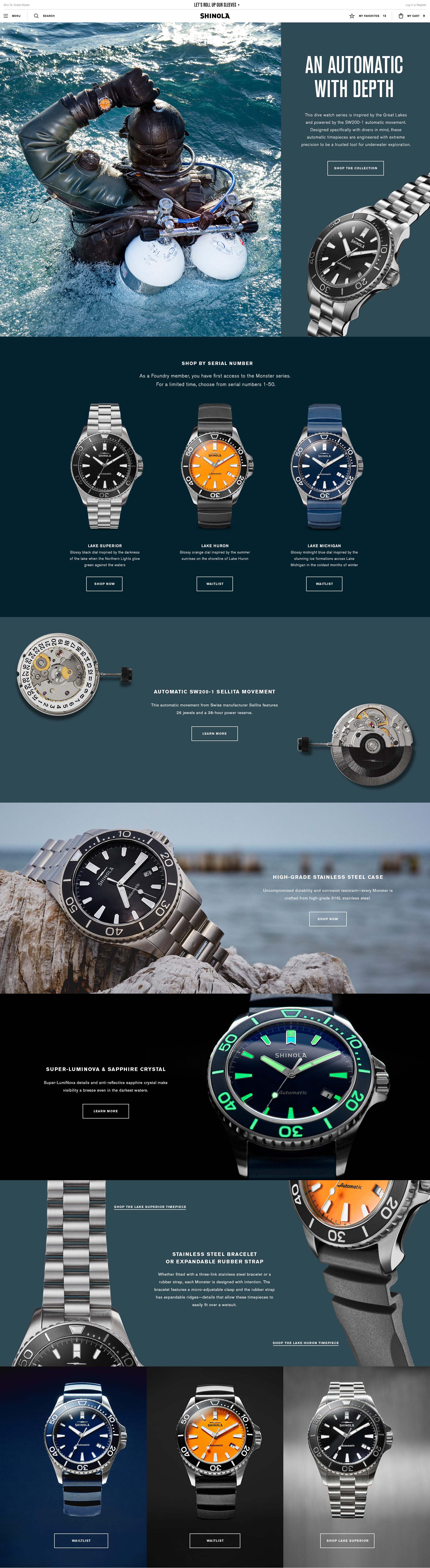 The Landing Page for the Launch for the Limited Edition watch, The Lake Erie Monster. Shinola’s first Automatic Watch and first Official Dive Watch. 2017
