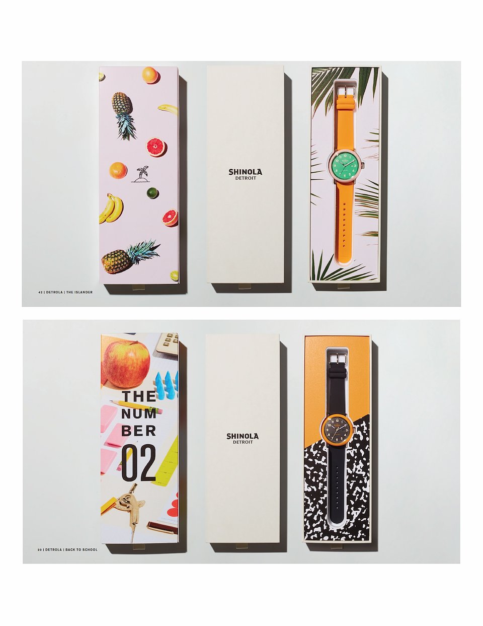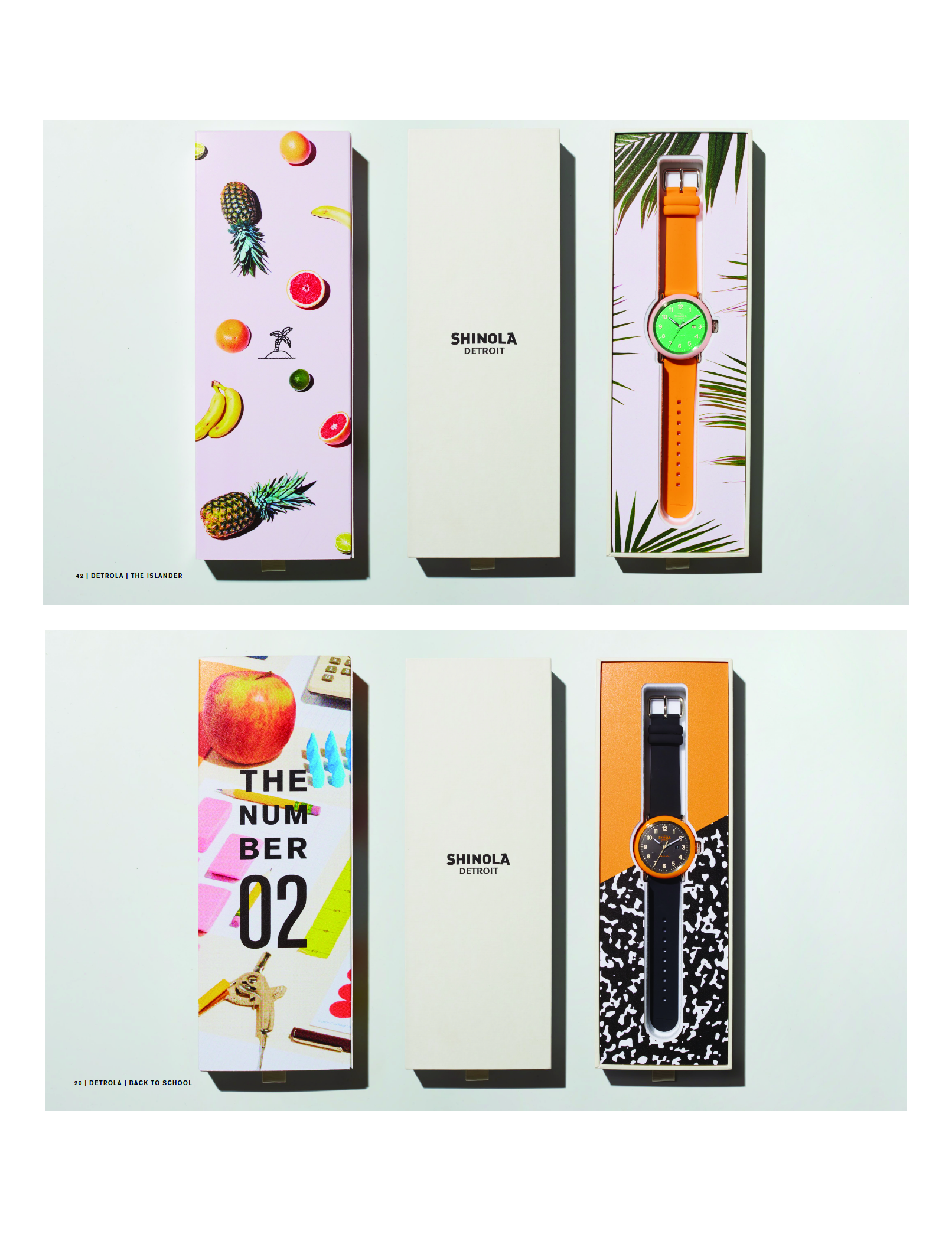 When Shinola was ready to launc a new line of bold colorful watches with bright and soulful graphics called Detrola, my team and I set to work to brand and develop the new visual language of watch graphics and packaging for the first set of 10 watches, each with its own theme and colorway. Each watch box had a unique printed sleeve and insert that also came with a unique poster.